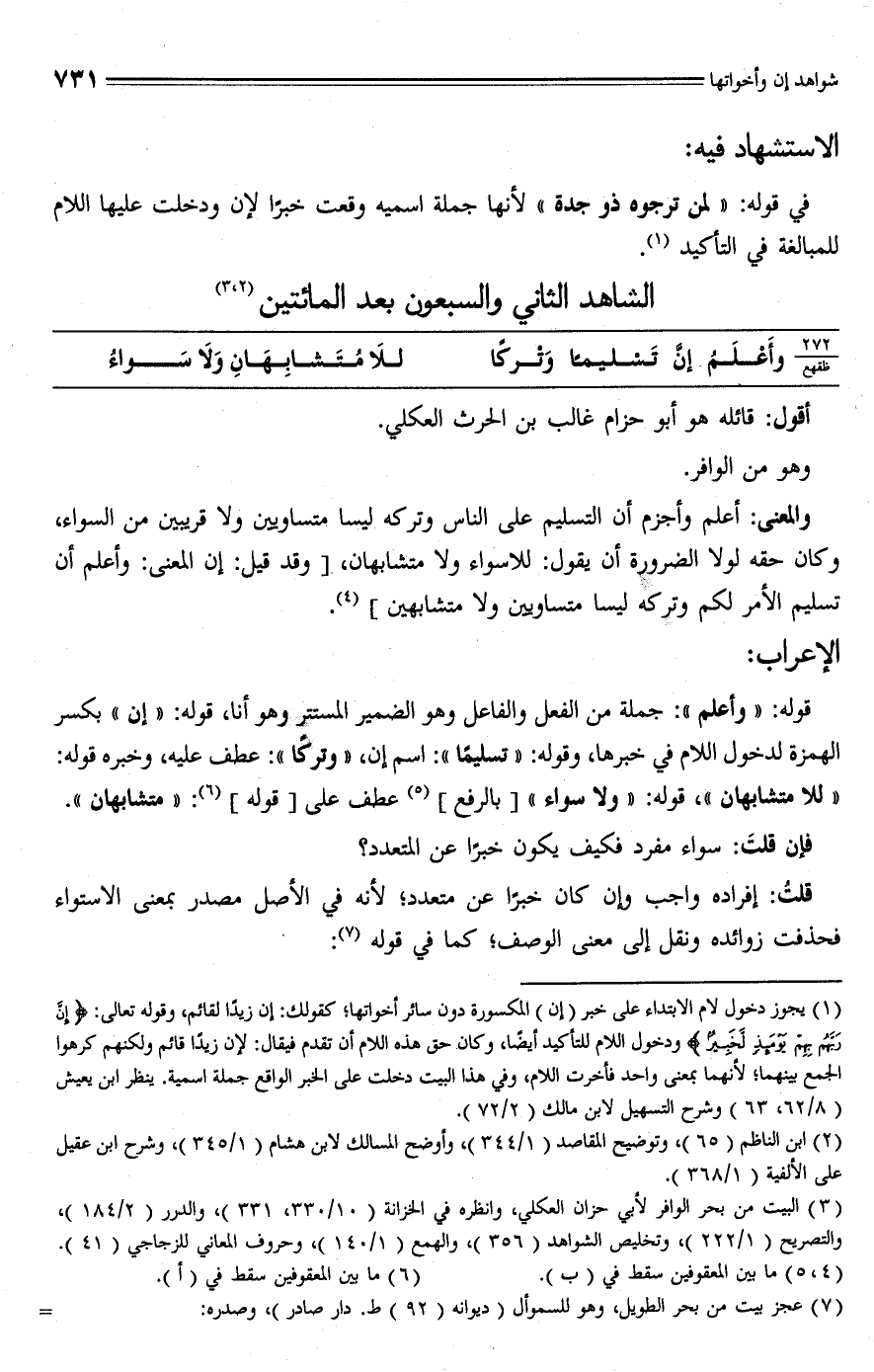 والمعنى: أعلم وأجزم أن التسليم على النَّاس وتركه ليسا متساويين ولا قريبين من السواء، وكان حقه لولا الضرورة أن يقول: للاسواء ولا متشابهان، [وقد قيل: إن المعنى: وأعلم أن تسليم الأمر لكم وتركه ليسا متساويين ولا متشابهين] (¬4).