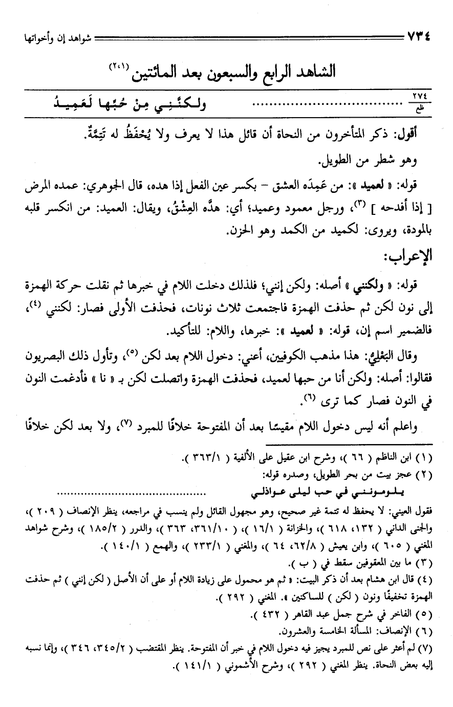 (¬4) قال ابن هشام بعد أن ذكر البيت: "ثم هو محمول على زيادة اللام أو على أن الأصل (لكن إنني) ثم حذفت الهمزة تخفيفًا ونون (لكن) للساكنين". المغني (292).