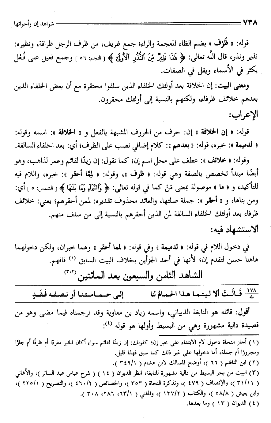 (¬3) البيت من بحر البسيط من دالية مشهورة للنابغة، انظر الديوان (14) (شرح عباس عبد الساتر)، والأغاني (11/ 31)، والإنصاف (479)، وتذكرة النحاة (353)، والخصائص (2/ 460)، والتصريح (1/ 225)، وابن يعيش (8/ 58)، والكتاب (2/ 137)، والمغني (1/ 63، 286، 308).