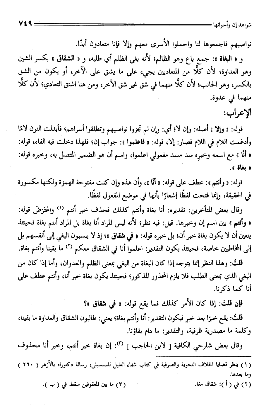 و"البغاة": جمع باغ وهو الظالم؛ لأنه بغى الظلم أي طلبه، و"الشقاق" بكسر الشين وهو العداوة؛ لأن كلًّا من المتعاديين يجيء على ما يشق على الآخر، أو يكون من الشق بالكسر، وهو الجانب؛ لأن كلًّا منهما في شق غير شق الآخر، ومن هنا اشتق التعادي؛ لأن كلًّا منهما في عدوة.