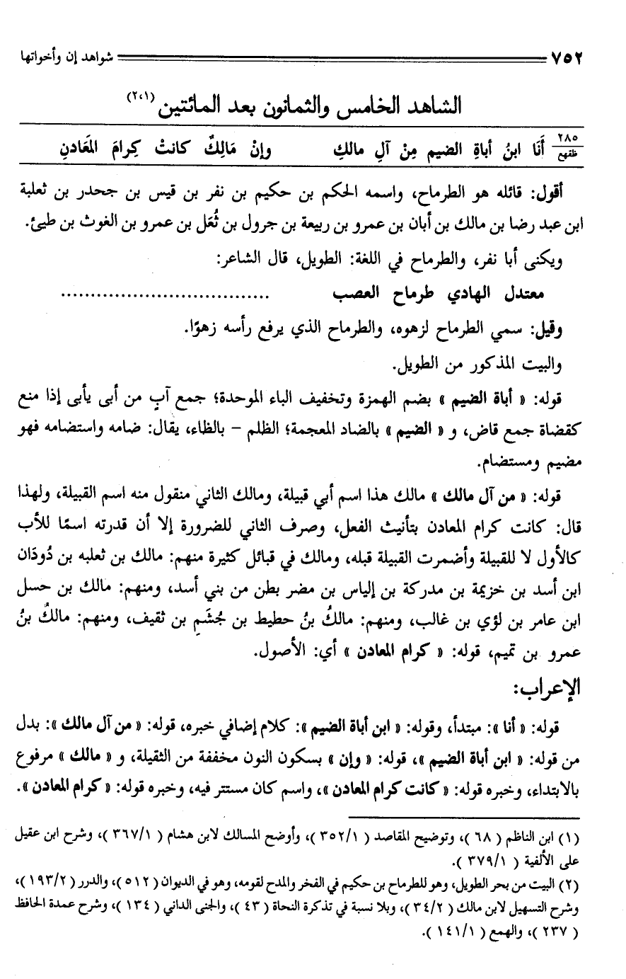 (¬2) البيت من بحر الطويل، وهو للطرماح بن حكيم في الفخر والمدح لقومه، وهو في الديوان (512)، والدرر (2/ 193)، وشرح التسهيل لابن مالك (2/ 34)، وبلا نسبة في تذكرة النحاة (43)، والجنى الداني (134)، وشرح عمدة الحافظ (237)، والهمع (1/ 141).