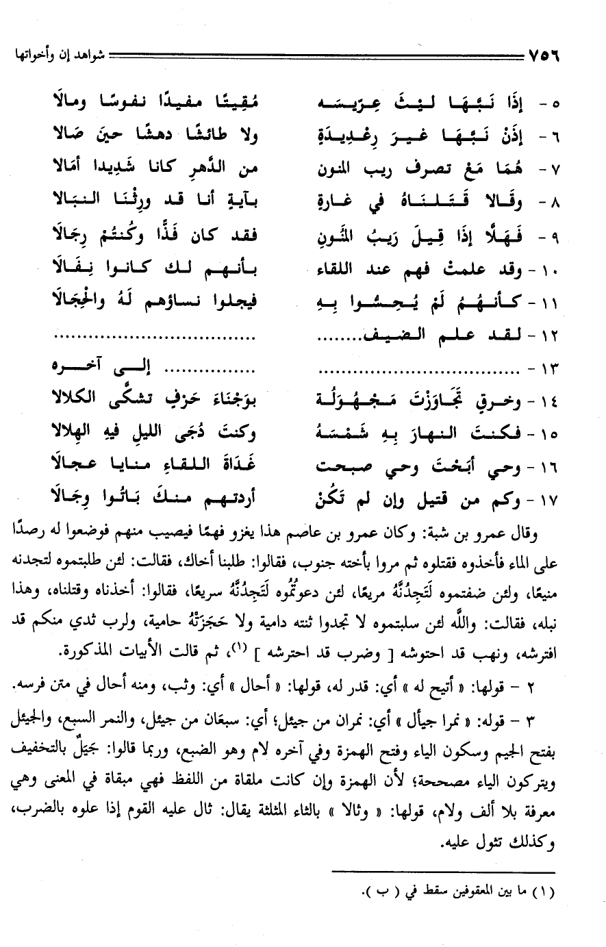 وقال عمرو بن شبة: وكان عمرو بن عاصم هذا يغزو فهمًا فيصيب منهم فوضعوا له رصدًا على الماء فأخذوه فقتلوه ثم مروا بأخته جنوب، فقالوا: طلبنا أخاك، فقالت: لئن طلبتموه لتجدنه منيعًا, ولئن ضفتموه لَتَجِدُنَّهُ مريعًا، لئن دعوُتمُوه لَتَجِدُنَّهُ سريعًا، فقالوا: أخذناه وقتلناه، وهذا نبله، فقالت: والله لئن سلبتموه لا تجدوا ثنته دامية ولا حَجَزَتْهُ حامية، ولرب ثدي منكم قد افترشه، ونهب قد احتوشه [وضرب قد احترشه] (¬1)، ثم قالت الأبيات المذكورة.