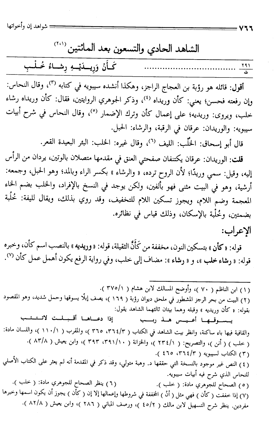 أقول: قائله هو رؤبة بن العجاج الراجز، وهكذا أنشده سيبويه في كتابه (¬3)، وقال النحاس: وإن رفعته فحسن؛ يعني: كأن وريداه (¬4)، وذكر الجوهري الروايتين، فقال: كأن وريداه رشاء خلب، ويروى: وريديه؛ على إعمال كأن وترك الإضمار (¬5)، وقال النحاس في شرح أبيات سيبويه: والوريدان: عرقان في الرقبة، والرشاء: الحبل.