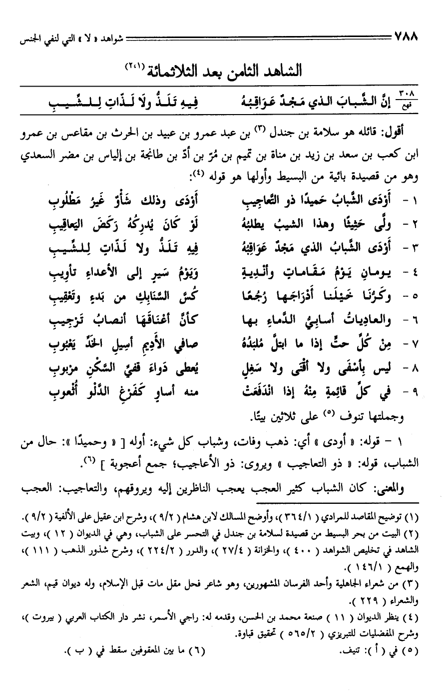 (¬2) البيت من بحر ىالبسيط من قصيدة لسلامة بن جندل في التحسر على الشباب، وهي في الديوان (12)، وبيت الشاهد في تخليص الشواهد (400)، والخزانة (4/ 27)، والدرر (2/ 224)، وشرح شذور الذهب (111)، والهمع (1/ 146).