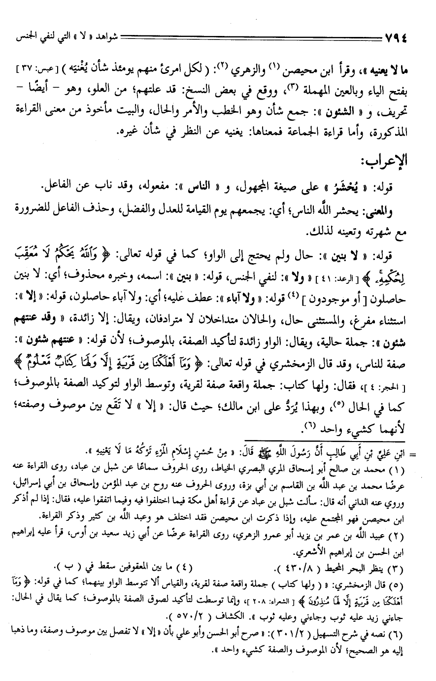 قوله: "لا بنين": حال ولم يحتج إلى الواو؛ كما في قوله تعالى: {وَاللَّهُ يَحْكُمُ لَا مُعَقِّبَ لِحُكْمِهِ} [الرعد: 41] "ولا": لنفي الجنس، قوله: "بنين": اسمه، وخبره محذوف؛ أي: لا بنين حاصلون [أو موجودون] (¬4) قوله: "ولا آباء": عطف عليه؛ أي: ولا آباء حاصلون، قوله: "إلا": استثناء مفرغ، والمستثنى حال، والحالان متداخلان لا مترادفان، ويقال: إلا زائدة، "وقد عنتهم شئون": جملة حالية، ويقال: الواو زائدة لتأكيد الصفة، بالموصوف؛ لأن قوله: "عنتهم شئون": صفة للناس، وقد قال الزمخشري في قوله تعالى: {وَمَا أَهْلَكْنَا مِنْ قَرْيَةٍ إلا وَلَهَا كِتَابٌ مَعْلُومٌ} [الحجر: 4] فقال: ولها كتاب: جملة واقعة صفة لقرية، وتوسط الواو لتوكيد الصفة بالموصوف؛ كما في الحال (¬5)، وبهذا يُرَدُّ على ابن مالك؛ حيث قال: "إلا" لا تَقَع بين موصوف وصفته، لأنهما كشيء واحد (¬6).