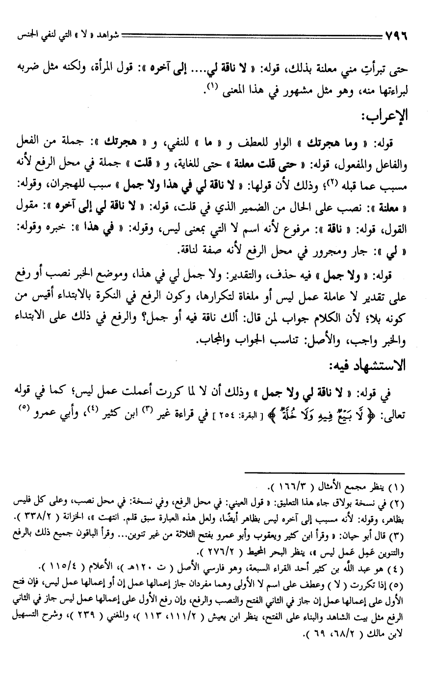 في قوله: "لا ناقة لي ولا جمل" وذلك أن لا لما كررت أعملت عمل ليس؛ كما في قوله تعالى: {لَا بَيْعٌ فِيهِ وَلَا خُلَّةٌ} [البقرة: 254] في قراءة غير (¬3) ابن كثير (¬4)، وأبي عمرو (¬5)