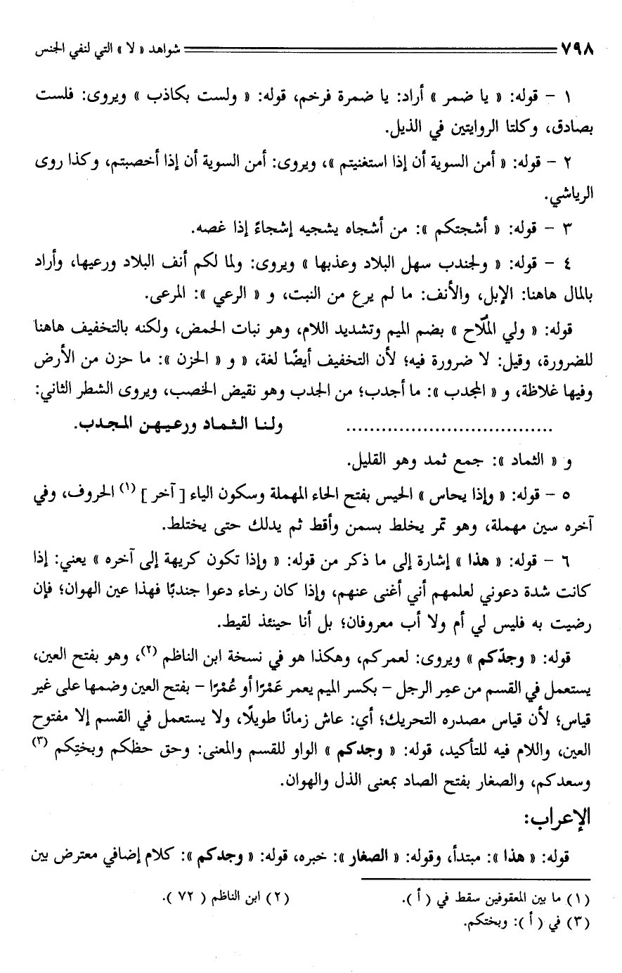 قوله: "وجدّكم" ويروى: لعمركم، وهكذا هو في نسخة ابن الناظم (¬2)، وهو بفتح العين، يستعمل في القسم من عمِر الرجل -بكسر الميم يعمر عَمرًا أو عُمرًا -بفتح العين وضمها على غير قياس؛ لأن قياس مصدره التحريك؛ أي: عاش زمانًا طويلًا, ولا يستعمل في القسم إلا مفتوح العين، والسلام فيه للتأكيد، قوله: "وجدكم" الواو للقسم والمعنى: وحق حظكم وبختِكم (¬3) وسعدكم، والصغار بفتح الصاد بمعنى الذل والهوان.