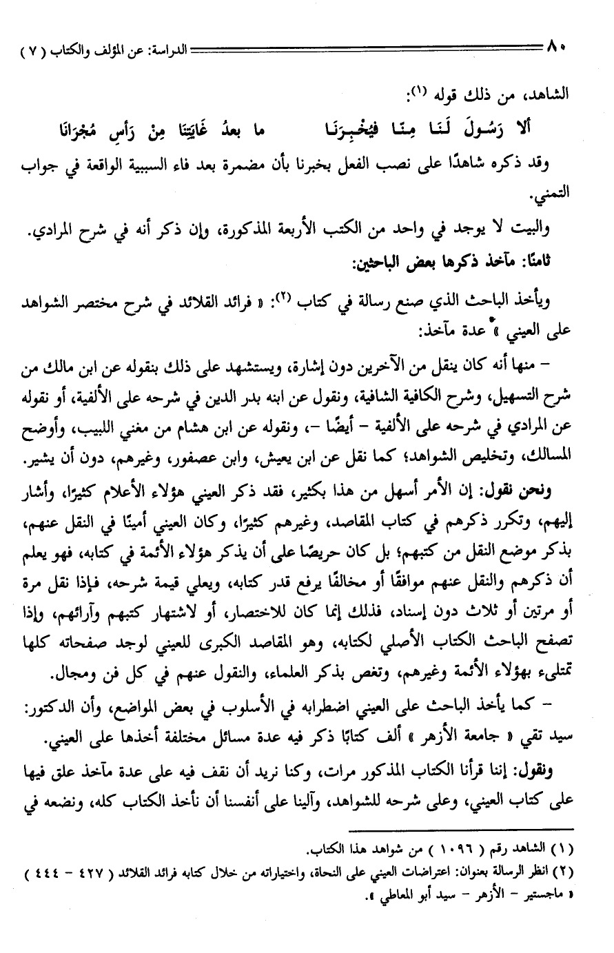 (¬2) انظر الرسالة بعنوان: اعتراضات العيني على النحاة، واختياراته من خلال كتابه فرائد القلائد (427 - 444) "ماجستير- الأزهر- سيد أبو المعاطي".