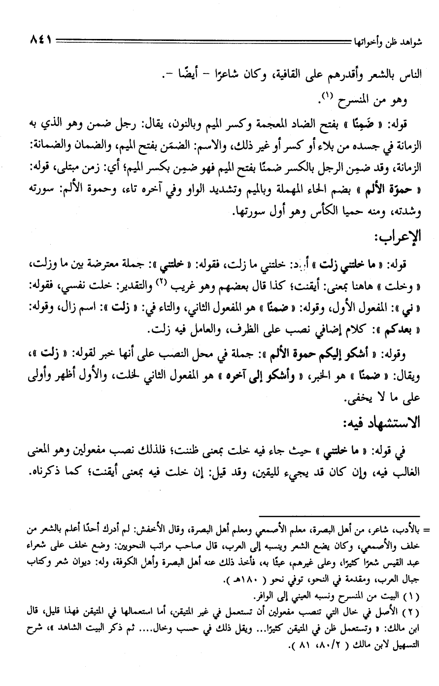 (¬2) الأصل في خال التي تنصب مفعولين أن تستعمل في غير المتيقن، أما استعمالها في المتيقن فهذا قليل، قال ابن مالك: "وتستعمل ظن في المتيقن كثيرًا ... ويقل ذلك في حسب وخال .... ثم ذكر البيت الشاهد"، شرح التسهيل لابن مالك (2/ 80، 81).