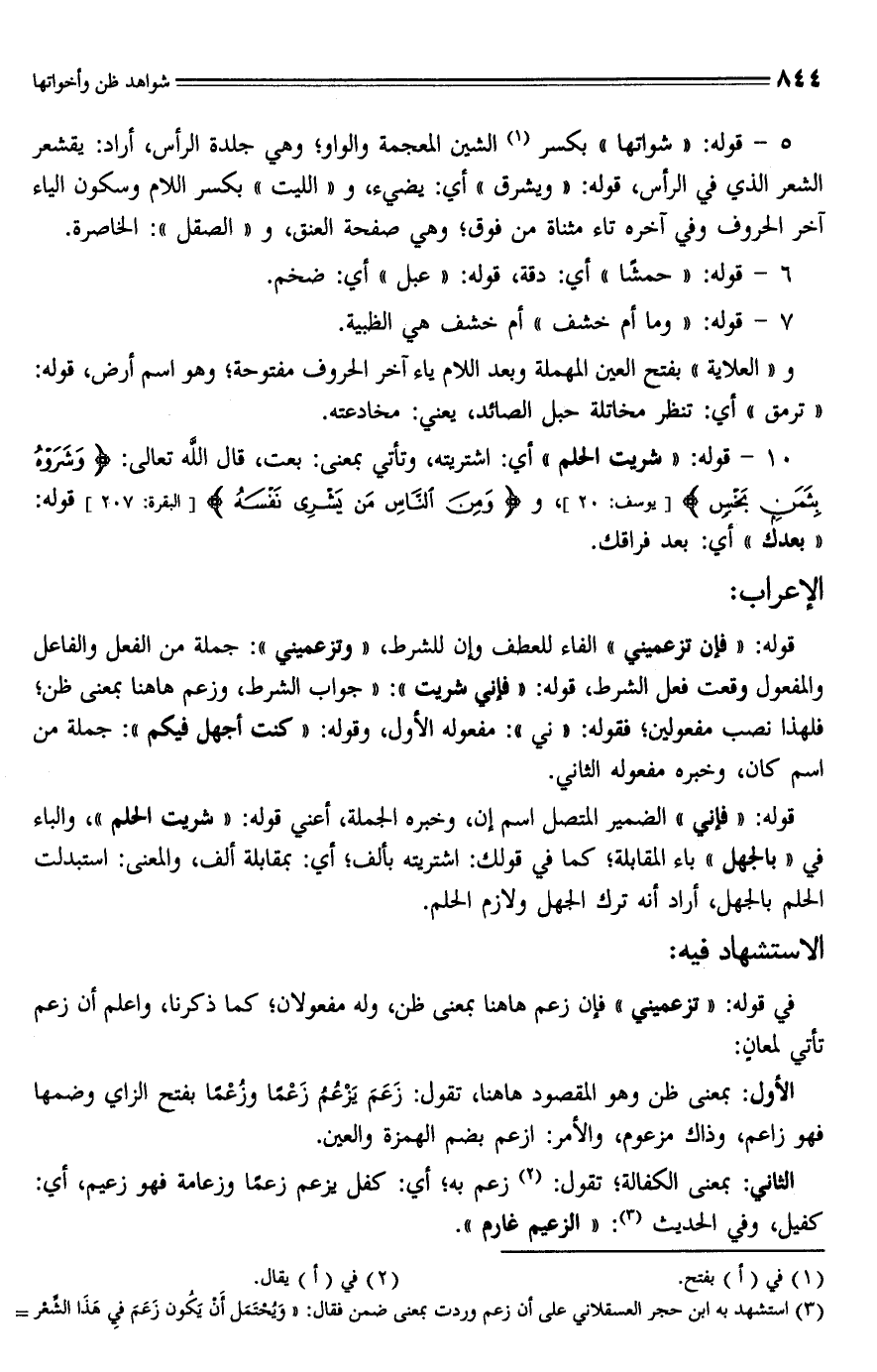 (¬3) استشهد به ابن حجر العسقلاني على أن زعم وردت بمعنى ضمن فقال: "وَيُحْتَمَل أنْ يَكُون زَعَمَ فيِ هَذَا الشِّعْر =