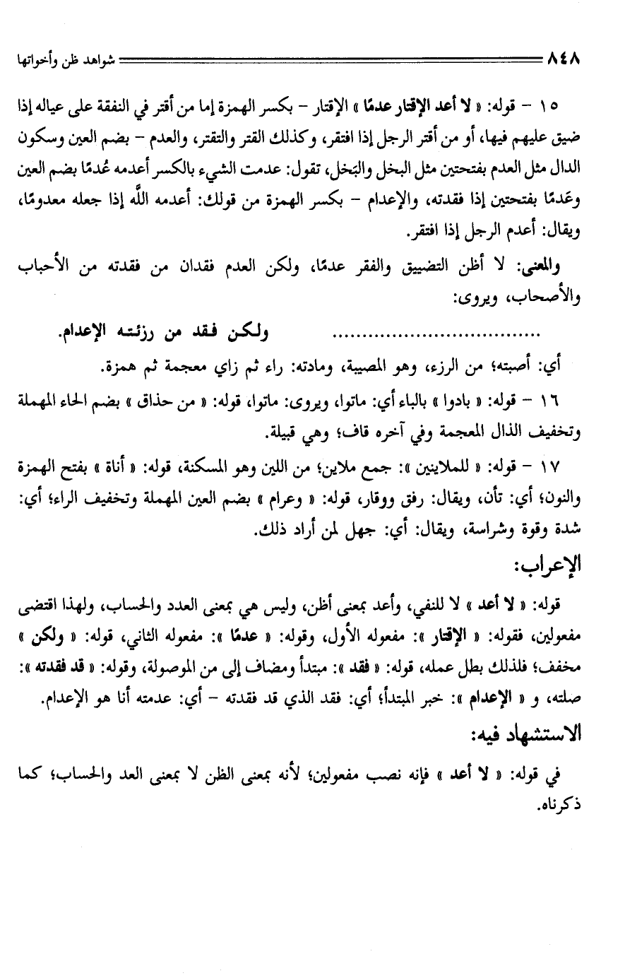 قوله: "لا أعد" لا للنفي، وأعد بمعنى أظن، وليس هي بمعنى العدد والحساب، ولهذا اقتضى مفعولين، فقوله: "الإقتار": مفعوله الأول، وقوله: "عدمًا": مفعوله الثاني، قوله: "ولكن" مخفف؛ فلذلك بطل عمله، قوله؛ "فقد": مبتدأ ومضاف إلى من الموصولة، وقوله: "قد فقدته": صلته، و "الإعدام": خبر المبتدأ؛ أي: فقد الذي قد فقدته - أي: عدمته أنا هو الإعدام.
