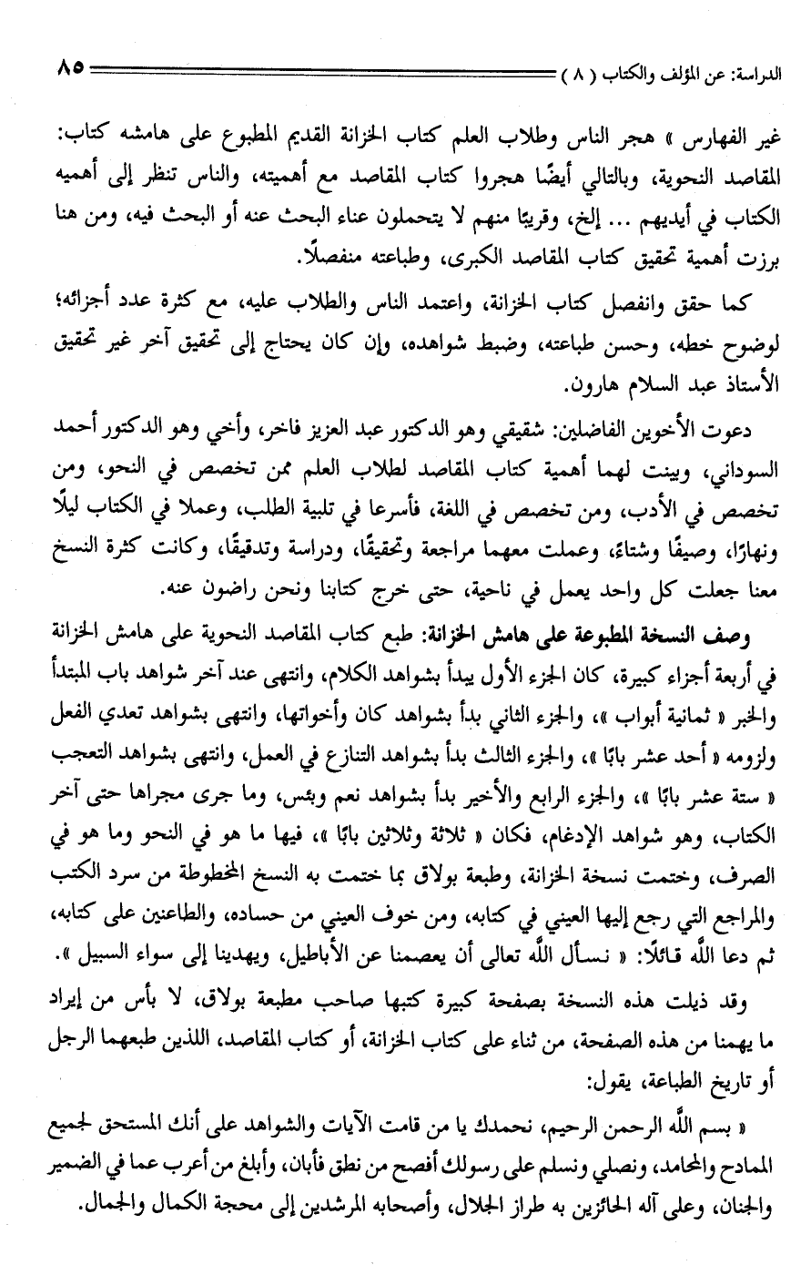 كما حقق وانفصل كتاب الخزانة، واعتمد النَّاس والطلاب عليه، مع كثرة عدد أجزائه؛ لوضوح خطه، وحسن طباعته، وضبط شواهده، وإن كان يحتاج إلى تحقيق آخر غير تحقيق الأستاذ عبد السَّلام هارون.