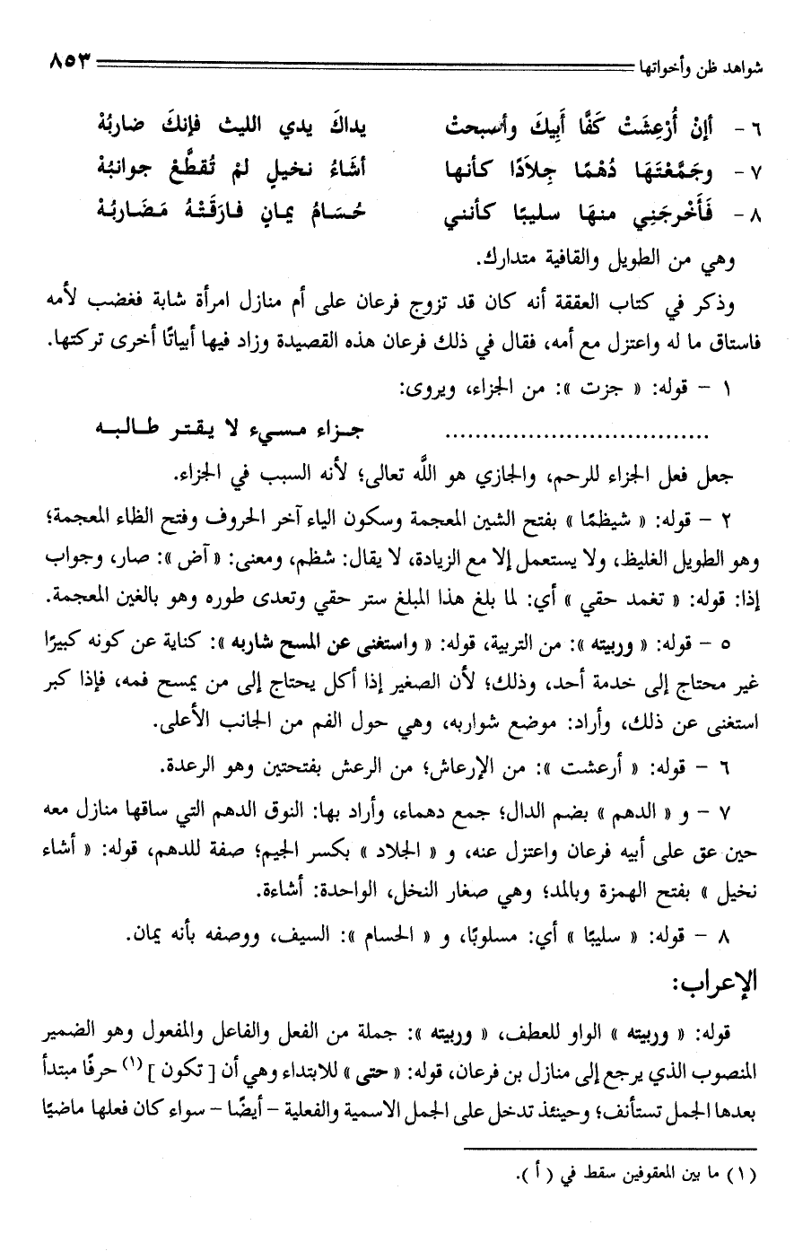 7 - و "الدهم" بضم الدال، جمع دهماء، وأراد بها: النوق الدهم التي ساقها منازل معه حين عق على أبيه فرعان واعتزل عنه، و "الجلاد" بكسر الجيم؛ صفة للدهم، قوله: "أشاء نخيل" بفتح الهمزة وبالمد؛ وهي صغار النخل، الواحدة: أشاءة.