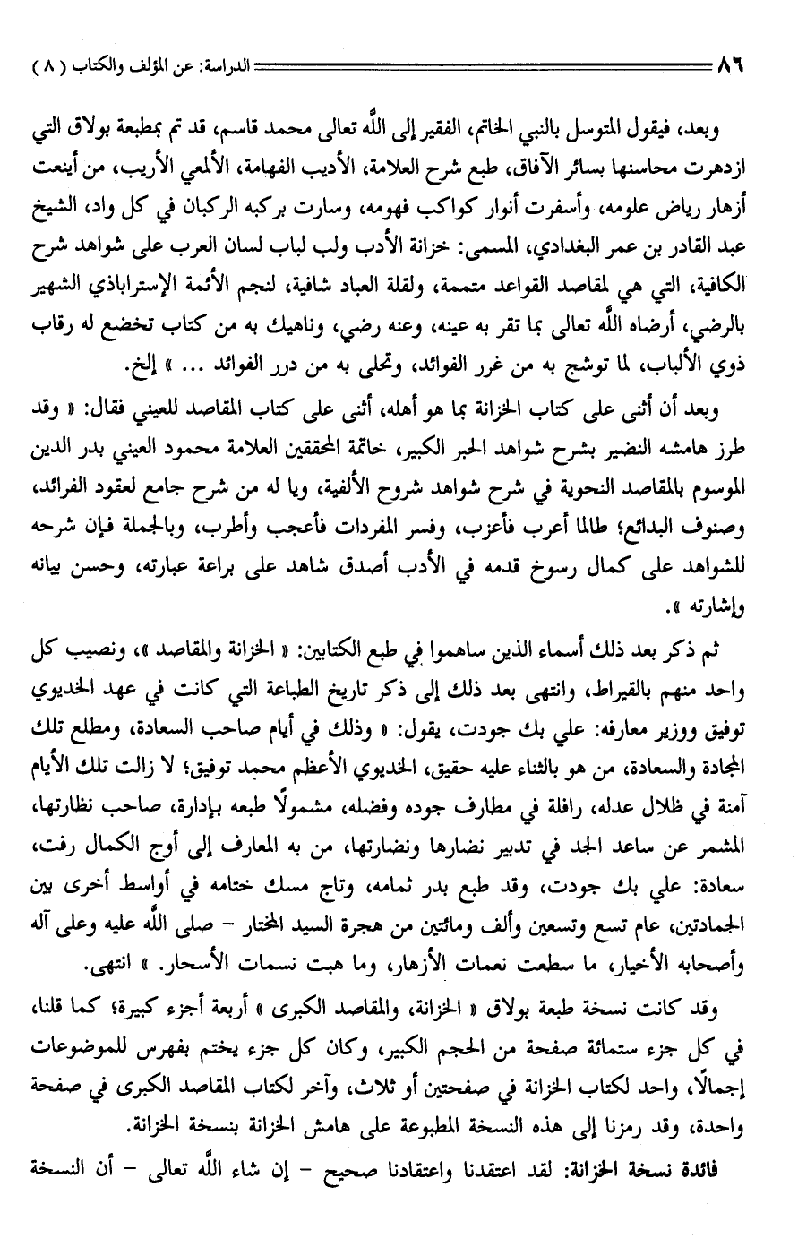 وبعد، فيقول المتوسل بالنبي الخاتم، الفقير إلى الله تعالى محمد قاسم، قد تم بمطبعة بولاق التي ازدهرت محاسنها بسائر الآفاق، طبع شرح العلامة، الأديب الفهامة، الألمعي الأريب، من أينعت أزهار رياض علومه، وأسفرت أنوار كواكب فهومه، وسارت بركبه الركبان في كل واد، الشَّيخ عبد القادر بن عمر البغدادي، المسمى: خزانة الأدب ولب لباب لسان العرب على شواهد شرح الكافية، التي هي لمقاصد القواعد متممة، ولقلة العباد شافية، لنجم الأئمة الإستراباذي الشَّهير بالرضي، أرضاه الله تعالى بما تقر به عينه، وعنه رضي، وناهيك به من كتاب تخضع له رقاب ذوي الألباب، لما توشج به من غرر الفوائد، وتحلى به من درر الفوائد ... " إلخ.