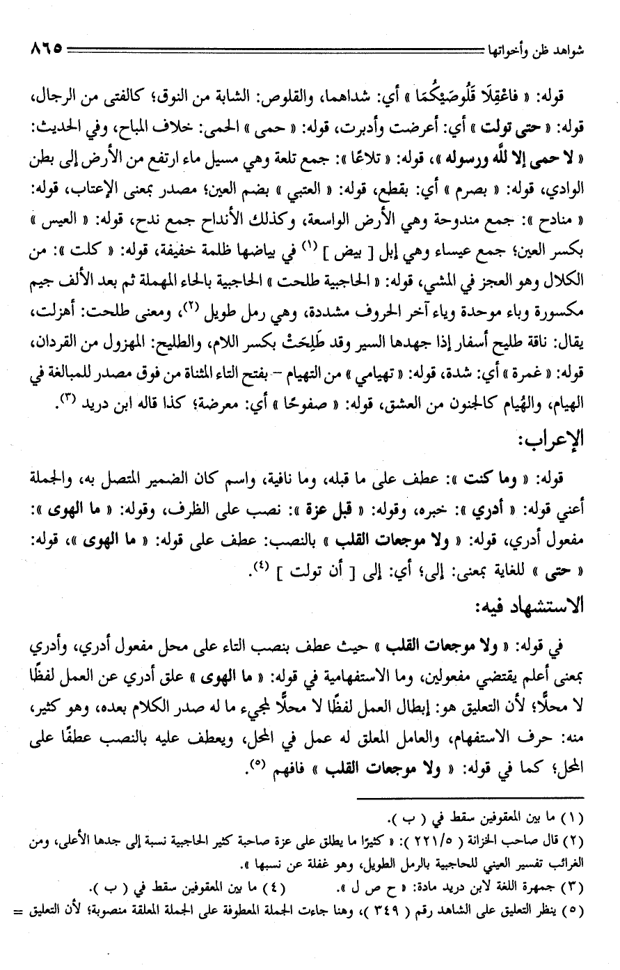في قوله: "ولا موجعات القلب" حيث عطف بنصب التاء على محل مفعول أدري، وأدري بمعنى أعلم يقتضي مفعولين، وما الاستفهامية في قوله: "ما الهوى" علق أدري عن العمل لفظًا لا محلًّا؛ لأن التعليق هو: إبطال العمل لفظًا لا محلًّا لمجيء ما له صدر الكلام بعده، وهو كثير، منه: حرف الاستفهام، والعامل المعلق له عمل في المحل، ويعطف عليه بالنصب عطفًا على المحل؛ كما في قوله: "ولا موجعات القلب" فافهم (¬5).