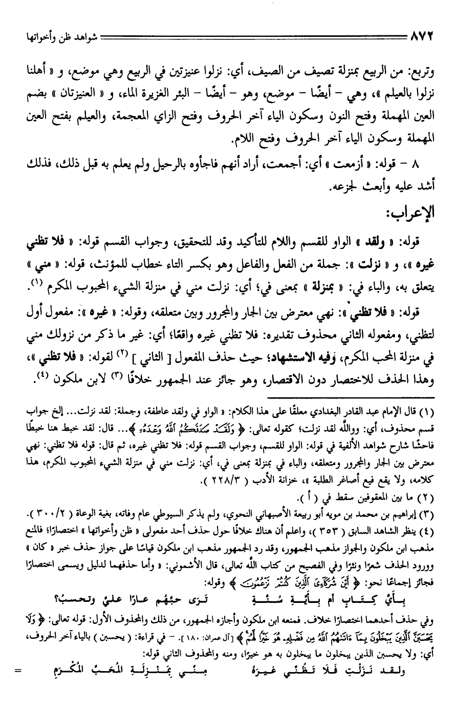 (¬1) قال الإمام عبد القادر البغدادى معلقًا على هذا الكلام: "الواو في ولقد عاطفة، وجملة: لقد نزلت ... إلخ جواب قسم محذوف، أي: ووالله لقد نزلت؛ كقوله تعالى: {وَلَقَدْ صَدَقَكُمُ اللَّهُ وَعْدَهُ} ... قال: لقد خبط هنا خبطًا فاحشًا شارح شواهد الألفية في قوله: الواو للقسم، وجواب القسم قوله: فلا تظني غيره، ثم قال: قوله فلا تظني: نهي معترض بين الجار والمجرور ومتعلقه، والباء في بمنزلة بمعنى في، أي: نزلت مني في منزلة الشيء المحبوب المكرم، هذا كلامه، ولا يقع فيع أصاغر الطلبة"، خزانة الأدب (3/ 228).