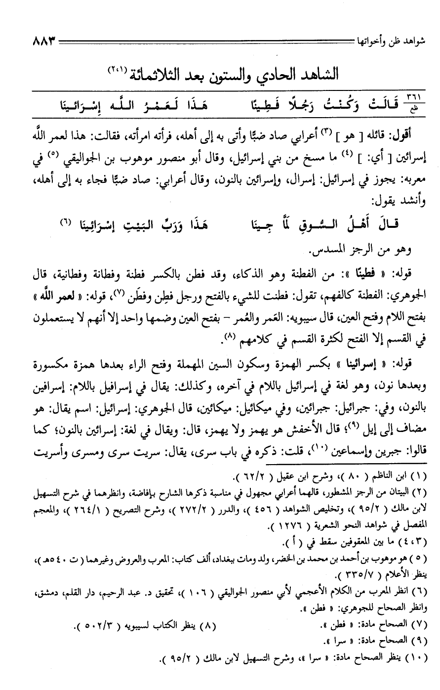 أقول: قائله [هو] (¬3) أعرابي صاد ضبًّا وأتى به إلى أهله، فرأته امرأته، فقالت: هذا لعمر الله إسرائين [أي]، (¬4) ما مسخ من بني إسرائيل، وقال أبو منصور موهوب بن الجواليقي (¬5) في معربه: يجوز في إسرائيل: إسرال، وإسرائين بالنون، وقال أعرابي: صاد ضبًّا فجاء به إلى أهله، وأنشد يقول:
