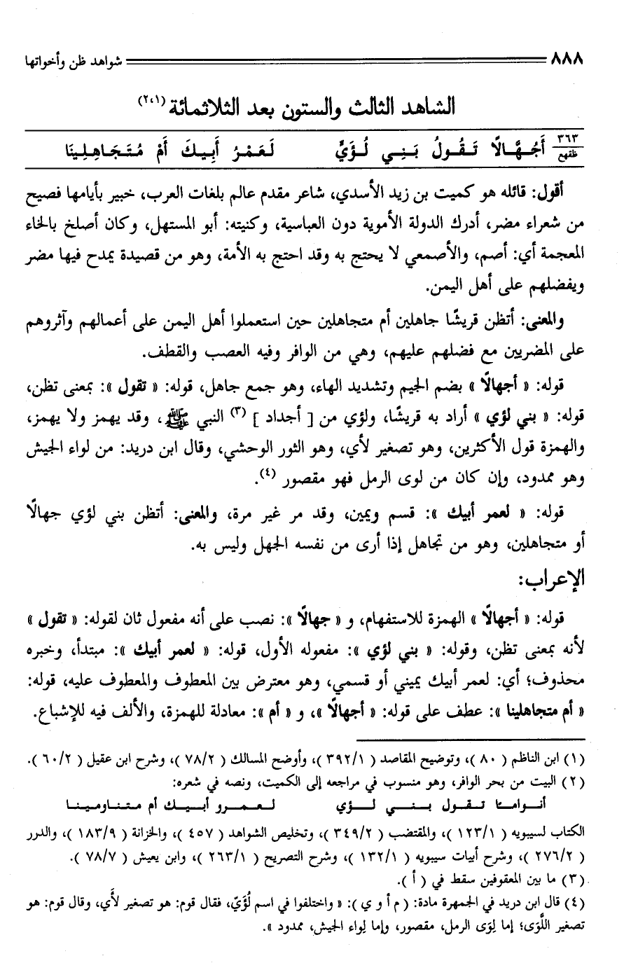قوله: "أجهالًا" الهمزة للاستفهام، و"جهالًا": نصب على أنه مفعول ثان لقوله: "تقول" لأنه بمعنى تظن، وقوله: "بني لؤي": مفعوله الأول، قوله: "لعمر أبيك": مبتدأ، وخبره محذوف؛ أي: لعمر أبين يميني أو قسمي، وهو معترض بين المعطوف والمعطوف عليه، قوله: "أم متجاهلينا": عطف على قوله: "أجهالًا"، و"أم": معادلة للهمزة، والألف فيه للإشباع.