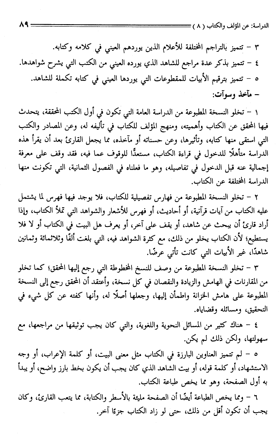 1 - تخلو النسخة المطبوعة من الدراسة العامة التي تكون في أول الكتب المحققة، يتحدث فيها المحقق عن الكتاب وأهميته، ومنهج المؤلف للكتاب في تأليفه له، وعن المصادر والكتب التي استقى منها كتابه، وتأثيرها، وعن حسناته أو مآخذه، ممَّا يجعل القارئ بعد أن يقرأ هذه الدراسة متأهلًا للدخول في قراءة الكتاب، مستعدًّا للوقوف عما فيه، فقد وقف على معرفة إجمالية عنه قبل الدخول في تفاصيله، وهو ما فعلناه في الفصول الثمانية، التي تكونت منها الدراسة المختلفة عن الكتاب.