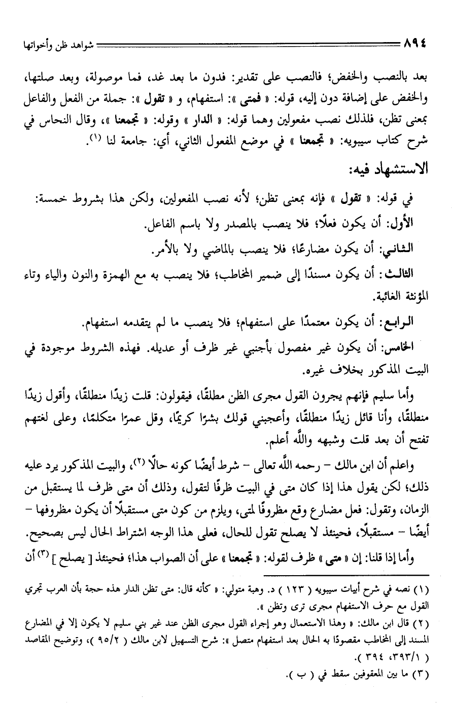 (¬2) قال ابن مالك: "وهذا الاستعمال وهو إجراء القول مجرى الظن عند غير بني سليم لا يكون إلا في المضارع المسند إلى المخاطب مقصودًا به الحال بعد استفهام متصل": شرح التسهيل لابن مالك (2/ 95)، وتوضيح المقاصد (1/ 393، 394).