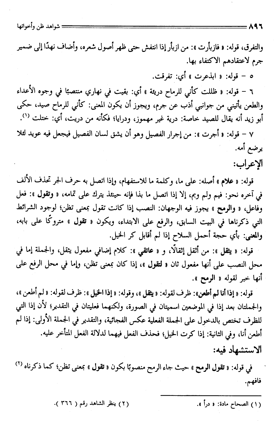 في قوله: "تقول الرمح" حيث جاء الرمح منصوبًا بكون "تقول" بمعنى تظن؛ كما ذكرناه (¬2) فافهم.