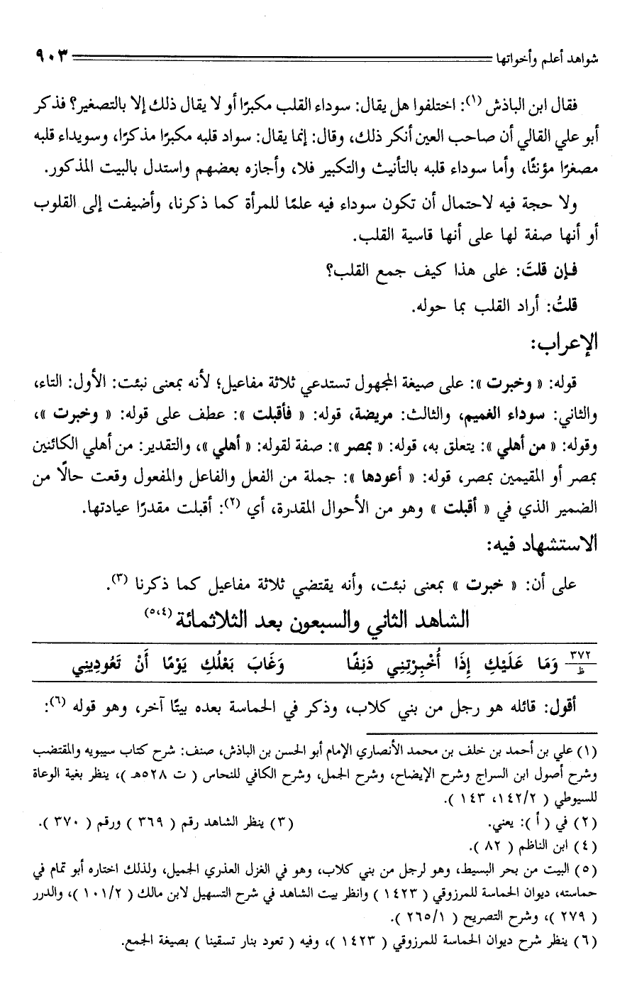 (¬5) البيت من بحر البسيط، وهو لرجل من بني كتاب، وهو في الغزل العذري الجميل، ولذلك اختاره أبو تمام في حماسته، ديوان الحماسة للمرزوقي (1423) وانظر بيت الشاهد في شرح التسهيل لابن مالك (2/ 101)، والدرر (279)، وشرح التصريح (1/ 265).