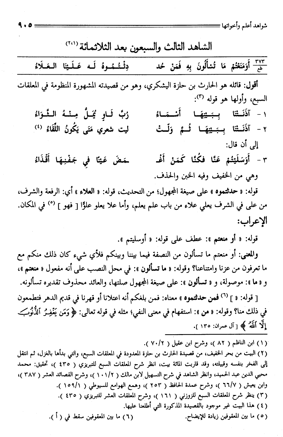 (¬2) البيت من بحر الخفيف، من قصيدة الحارث بن حلزة المعدودة في المعلقات السبع، والتي بدأها بالغزل، ثم انتقل إلى الفخر بنفسه وقبيلته، وقد قاربت المائة ليت، انظر شرح المعلقات السبع للتبريزي (435)، تحقيق: محمد محيي الدين عبد الحميد، وانظر الشاهد في شرح التسهيل لابن مالك (2/ 101)، وشرح القصائد العشر (387)، وابن يعيش (7/ 66)، وشرح عمدة الحافظ (253)، وهمع الهوامع للسيوطي (1/ 159).