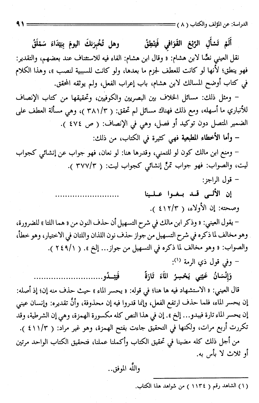 - ومثل ذلك: مسائل الخلاف بين البصريين والكوفيين، وتحقيقها من كتاب الإنصاف للأنباري ما أسهله، ومع ذلك فهناك مسائل لم تحقق: (3/ 381)، وهي مسألة العطف على الضمير المتصل دون توكيد أو فصل، وهي في الإنصاف: (ص 474).