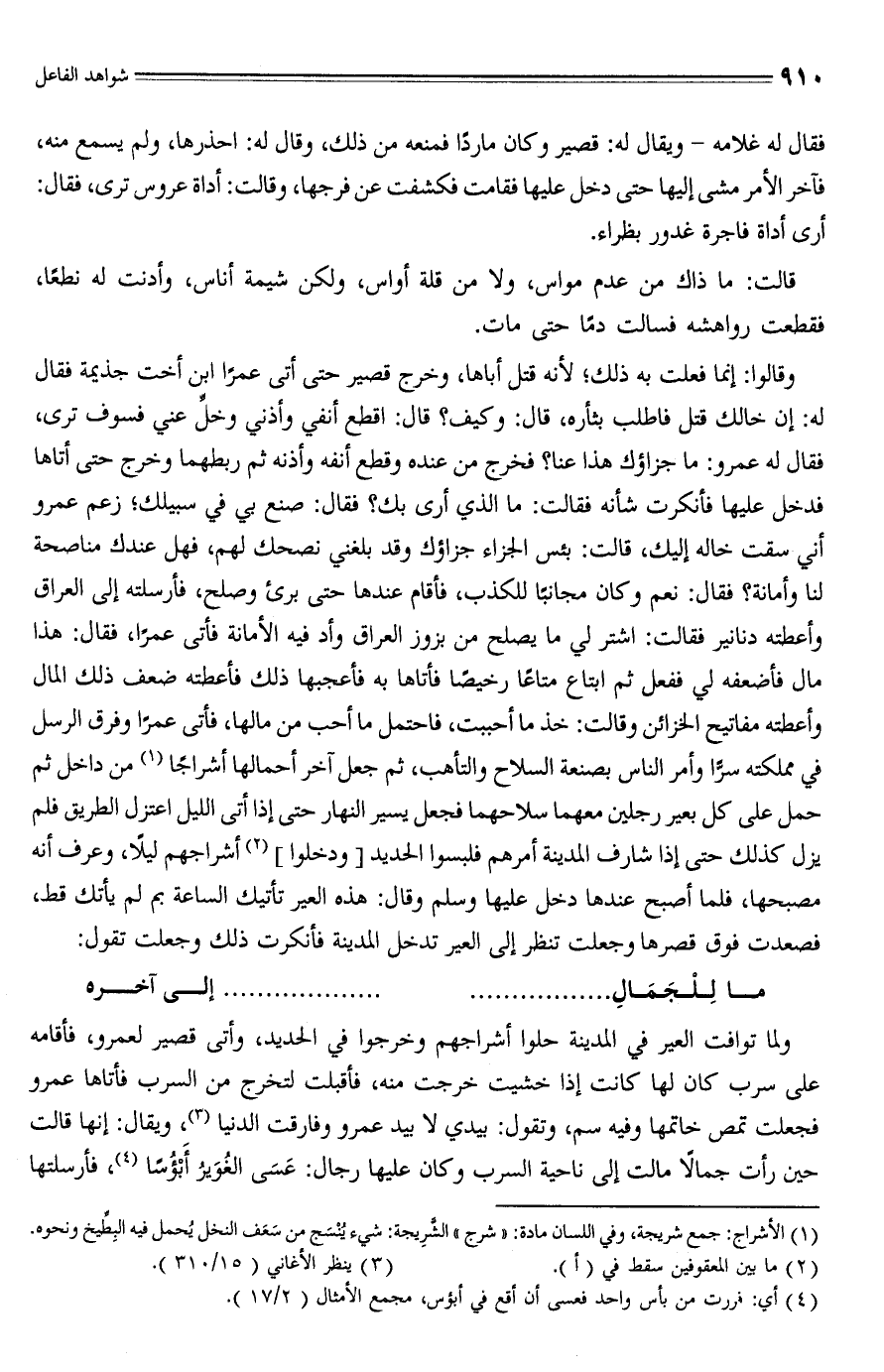 فقال له غلامه- ويقال له: قصير وكان ماردًا فمنعه من ذلك، وقال له: احذرها، ولم يسمع منه، فآخر الأمر مشى إليها حتى دخل عليها فقامت فكشفت عن فرجها، وقالت: أداة عروس ترى، فقال: أرى أداة فاجرة غدور بظراء.