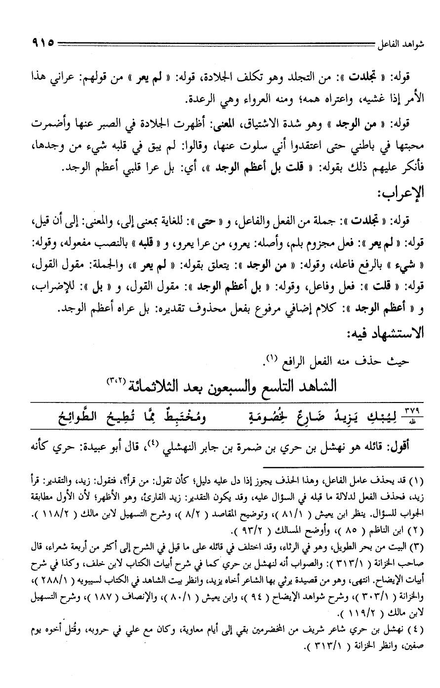 (¬3) البيت من بحر الطويل، وهو في الرثاء، وقد اختلف في قائله على ما قيل في الشرح إلى أكثر من أربعة شعراء، قال صاحب الخزانة (1/ 313): والصواب أنه لنهشل بن حري كما في شرح أبيات الكتاب لابن خلف، وكذا في شرح أبيات الإيضاح. انتهى، وهو من قصيدة يرثي بها الشاعر أخاه يزيد، وانظر بيت الشاهد في الكتاب لسيبويه (1/ 288)، والخزانة (1/ 303)، وشرح شواهد الإيضاح (94)، وابن يعيش (1/ 80)، والإنصاف (187)، وشرح التسهيل لابن مالك (2/ 119).