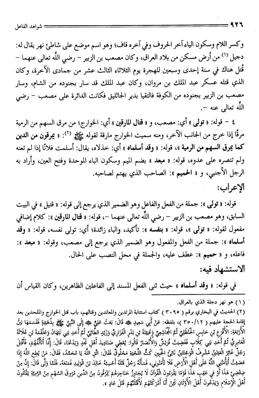 4 - قوله: "تولى" أي: مصعب، و "قتال المارقين" أي: الخوارج؛ من مرق السهم من الرمية مرقًا إذا خرج من الجانب الآخر، ومنه سميت الخوارج مارقة لقوله - صلى الله عليه وسلم - (¬2): "يمرقون من الدين كما يمرق السهم من الرمية"، قوله: "وقد أسلماه" أي: خذلاه، يقال: أسلمت فلانًا إذا لم تعنه ولم تنصره على عدوه، قوله: "مبعد" بضم الميم وسكون الباء الموحدة وفتح العين، وأراد به الرجل الأجنبي، و "الحميم": الصاحب الذي يهتم لصاحبه.