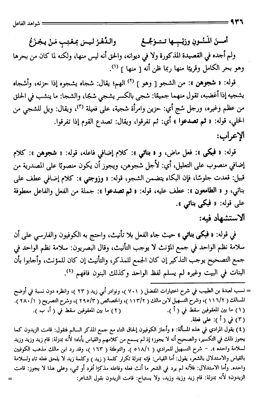 في قوله: "فبكى بناتي" حيث جاء الفعل بلا تأنيث، واحتج به الكوفيون والفارسي على أن سلامة نظم الواحد في جمع المؤنث لا يوجب التأنيث، وقال البصريون: سلامة نظم الواحد في جمع التصحيح يوجب التذكير إن كان الجمع للمذكر، والتأنيث إن كان للمؤنث، وأجابوا بأن البنات في البيت وغيره لم يسلم لفظ الواحد وكذلك البنون فافهم (¬4).