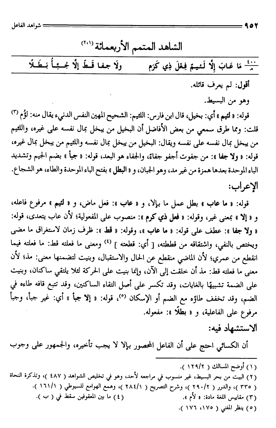 قوله: "ما عاب" بطل عمل ما بإلا، و"عاب": فعل ماض، و "لئيم" مرفوع فاعله، و "إلا" بمعنى غير، وقوله: "فعل ذي كرم": منصوب على المفعولية؛ لأن عاب يتعدى، قوله: "ولا جفا": عطف على قوله: "ما عاب"، وقوله: "قط": ظرف زمان لاستغراق ما مضى ويختص بالنفي، واشتقاقه من قططته، [أي: قطعته] (¬4) ومعنى ما فعلته قط: ما فعلته فيما انقطع من عمري؛ لأن الماضي منقطع عن الحال والاستقبال، وبنيت لتضمنها معنى: مذ؛ لأن معنى ما فعلته قط: مذ أن خلقت إلى الآن، وإنما بنيت على الحركة لئلا يلتقي ساكنان، وبنيت على الضمة تشبيهًا بالغايات، وقد تكسر على أصل التقاء الساكنين، وقد تتبع قافه طاءه في الضم، وقد تخفف طاؤه مع الضم أو الإسكان (¬5)، قوله: "إلا جبأ" أي: غير جبأ، وجبأ مرفوع على الفاعلية، و "بطلًا": مفعوله.