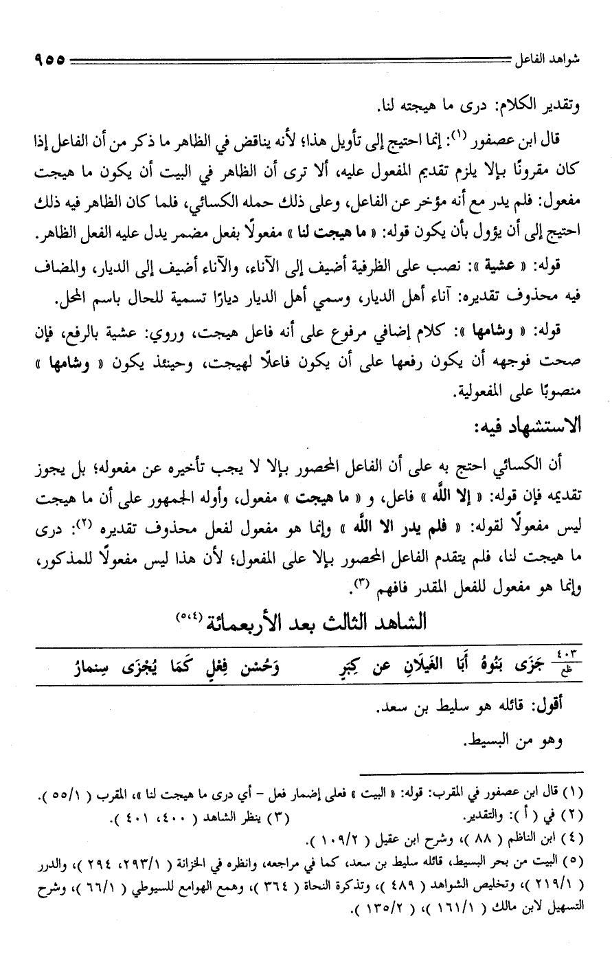 (¬5) البيت من بحر البسيط، قائله سليط بن سعد، كما في مراجعه، وانظره في الخزانة (1/ 293، 294)، والدرر (1/ 219)، وتخليص الشواهد (489)، وتذكرة النحاة (364)، وهمع الهوامع للسيوطي (1/ 66)، وشرح التسهيل لابن مالك (1/ 161)، (2/ 135).
