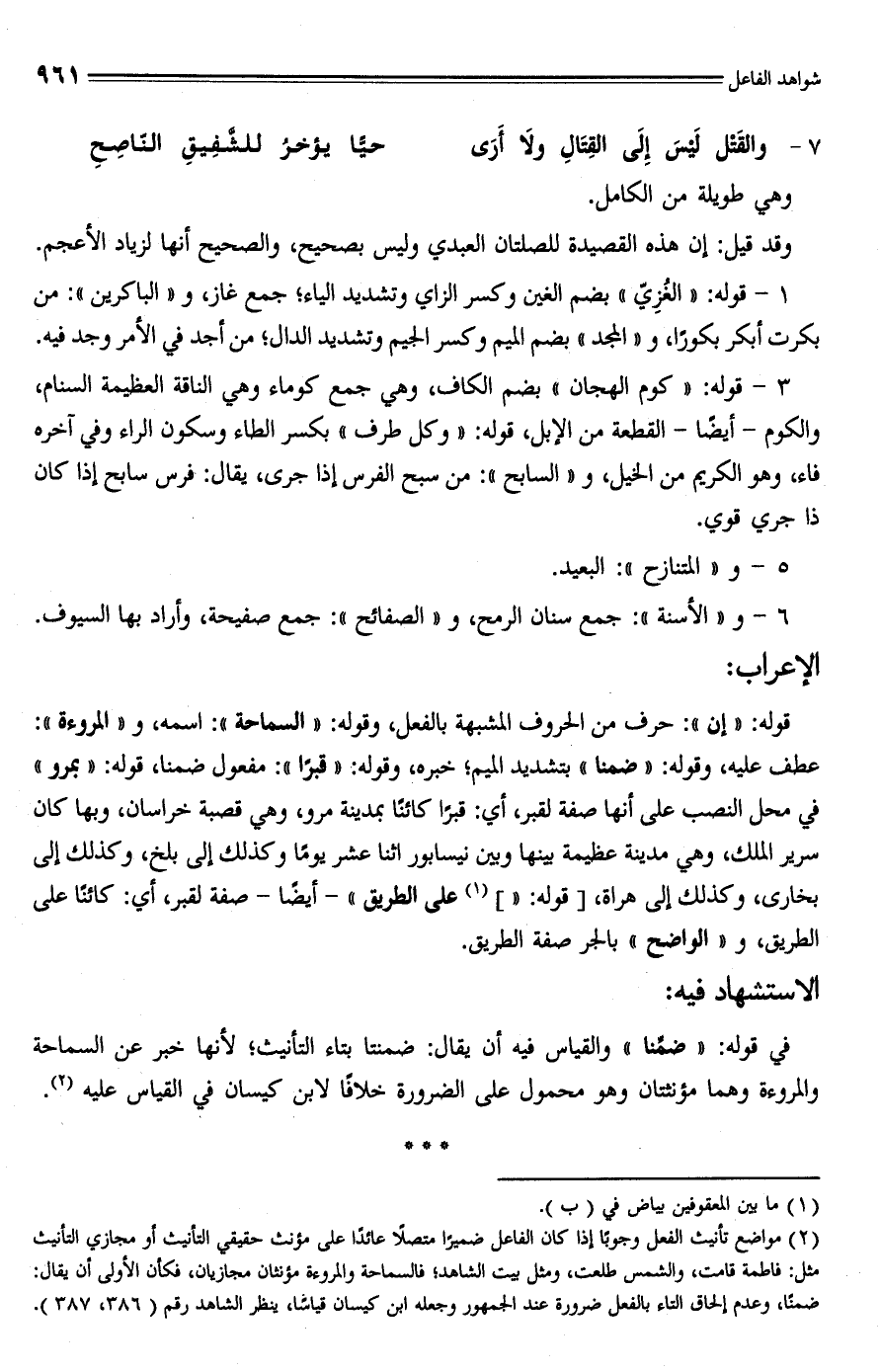 (¬2) مواضع تأنيث الفعل وجوبًا إذا كان الفاعل ضميرًا متصلًا عائدًا على مؤنث حقيقي التأنيث أو مجازي التأنيث مثل: فاطمة قامت، والشمس طلعت، ومثل بيت الشاهد؛ فالسماحة والمروءة مؤنثان مجازيان، فكان الأولى أن يقال: ضمنا، وعدم إلحاق التاء بالفعل ضرورة عند الجمهور وجعله ابن كيسان قياسًا، ينظر الشاهد رقم (386، 387).