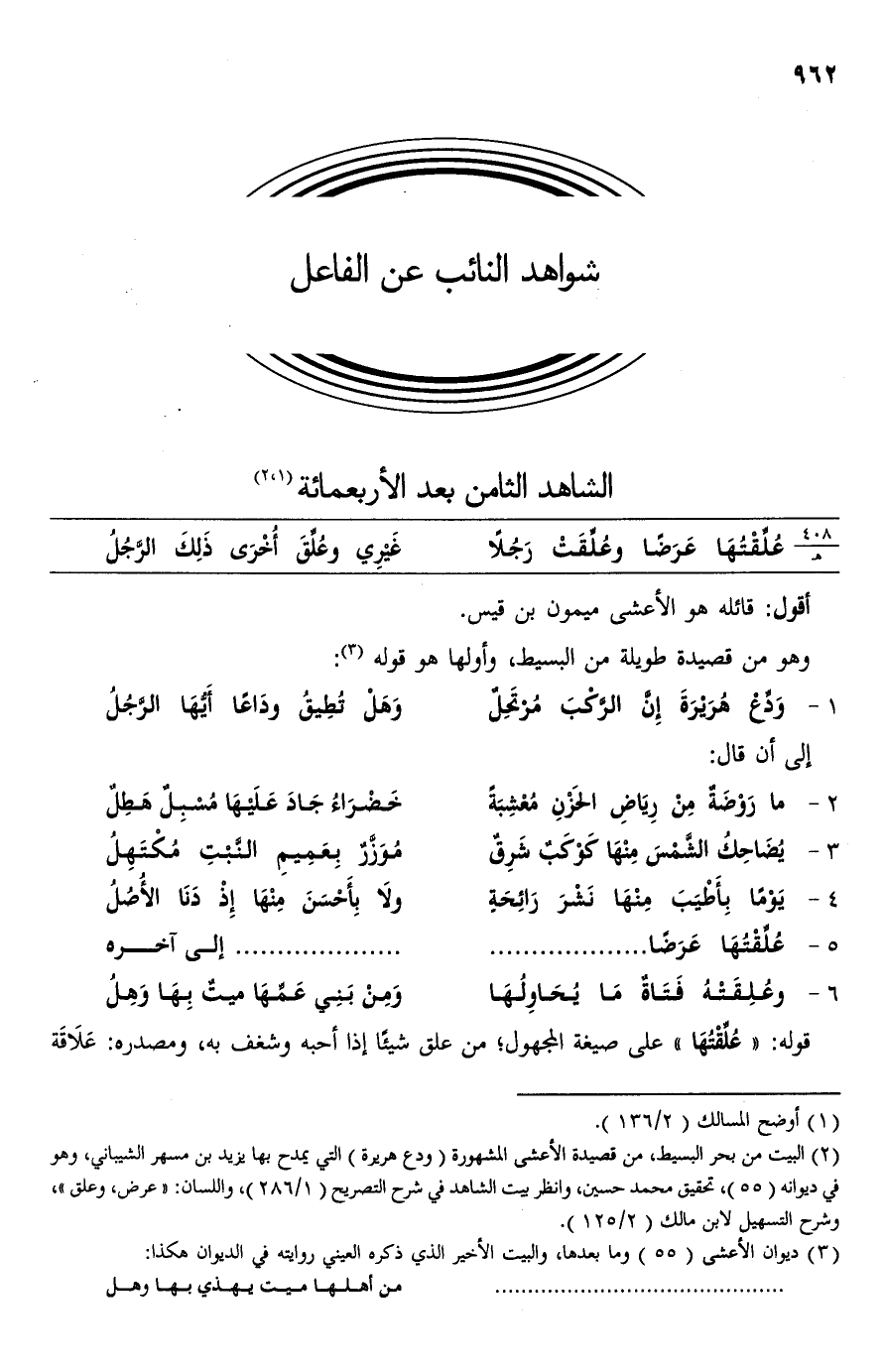 (¬2) البيت من بحر البسيط، من قصيدة الأعشى المشهورة (ودع هريرة) التي يمدح بها يزيد بن مسهر الشيباني، وهو في ديوانه (55)، تحقيق محمد حسين، وانظر بيت الشاهد في شرح التصريح (1/ 286)، واللسان: "عرض، وعلق"، وشرح التسهيل لابن مالك (2/ 125).