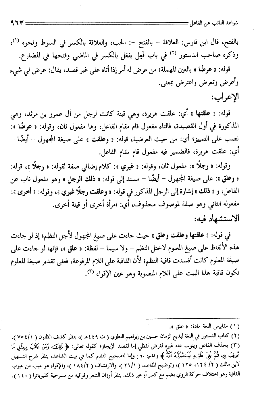 في قوله: "علقتها وعلقت وعلق" حيث جاءت على صيغ المجهول لأجل النظم؛ إذ لو جاءت هذه الألفاظ على صيغ المعلوم لاختل النظم -ولا سيما- لفظة: "علق"، فإنها لو جاءت على صيغة المعلوم كانت أفسدت قافية النظم؛ لأن القافية على اللام المرفوعة، فعلى تقدير صيغة المعلوم تكون قافية هذا البيت على اللام المنصوبة وهو عين الإقواء (¬3).