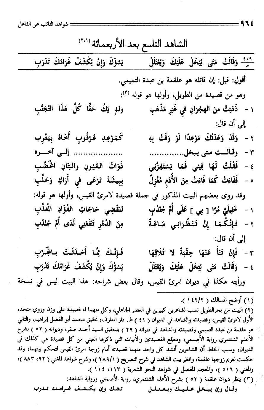 (¬2) البيت من بحر الطويل نسب لشاعرين كبيرين في العصر الجاهلي، وكل منهما له قصيدة على وزن وروي متحد، الأول لامرئ القيس، وقصيدته والشاهد في الديوان (41) ط. دار المعارف، تحقيق محمد أبو الفضل إبراهيم، والثاني هو علقمة بن عبدة التميمي وقصيدته والشاهد في ديوانه (29) بتحقيق السيد أحمد صغر، وديوانه (52) بشرح الأعلم الشنتمري رواية: الأصمعي، ومطع القصيدتين والأبيات التي ذكرها العيني من كل قصيدة هي كذلك في الديوان، وسبب الخلط أن الشاعرين أنشد كل واحد منهما قصيدته أمام زوجة امرئ القيس لتحكم بينهما، وقد حكمت لغريم زوجها علقمة، وانظر بيت الشاهد في شرح التصريح (1/ 289)، وشرح شواهد المغني (92، 883)، والمغني (516)، والمعجم المفصل في شواهد النحو الشعرية: (113، 114).