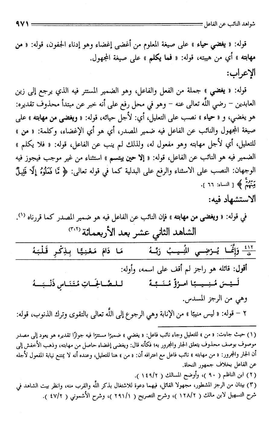 (¬1) حيث جاءت: "من" للتعليل وجاء نائب فاعل: "يغضي" ضميرًا مستترًا فيه جوازًا تقديره هو يعود إلى مصدر موصوف بوصف محذوف يتعلق الجار والمجرور به؛ فكأنه قال: ويغضى إغضاء حاصل من مهابته، وذهب الأخفش إلى أن الجار والمجرور: "من مهابته" نائب فاعل مع اعترافه أن: "من" هنا للتعليل، وعنده أنه لا يمتنع نيابة المفعول لأجله عن الفاعل بخلاف جمهور النحاة.