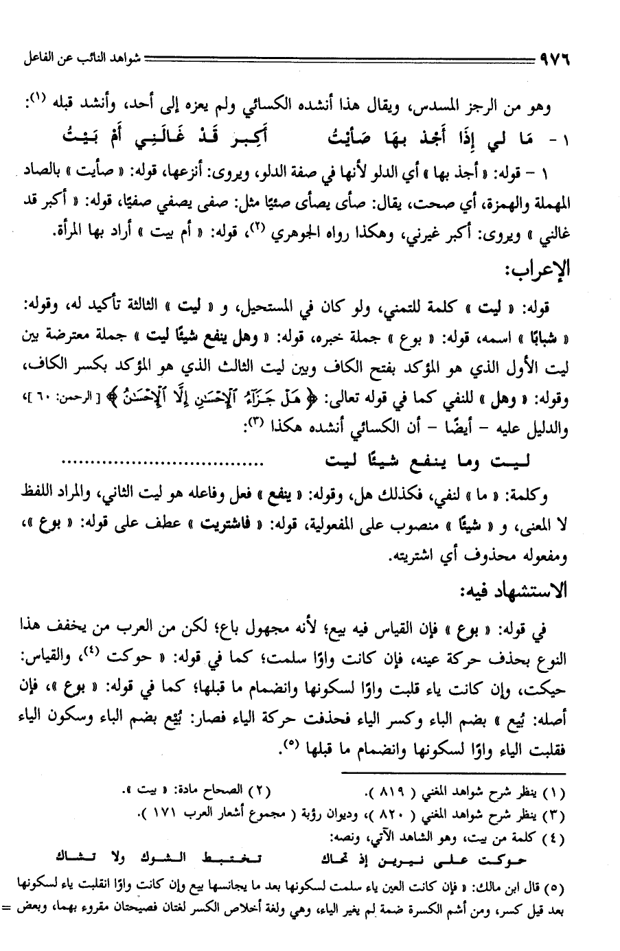 قوله: "ليت" كلمة للتمني، ولو كان في المستحيل، و"ليت" الثالثة تأكيد له، وقوله: "شبابًا" اسمه، قوله: "بوع" جملة خبره، قوله: "وهل ينفع شيئًا ليت" جملة معترضة بين ليت الأول الذي هو المؤكد بفتح الكاف وبين ليت الثالث الذي هو المؤكد بكسر الكاف، وقوله: "وهل" للنفي كما في قوله تعالى: {هَلْ جَزَاءُ الْإِحْسَانِ إلا الْإِحْسَانُ} [الرحمن: 60]، والدليل عليه -أيضًا- أن الكسائي أنشده هكذا (¬3):