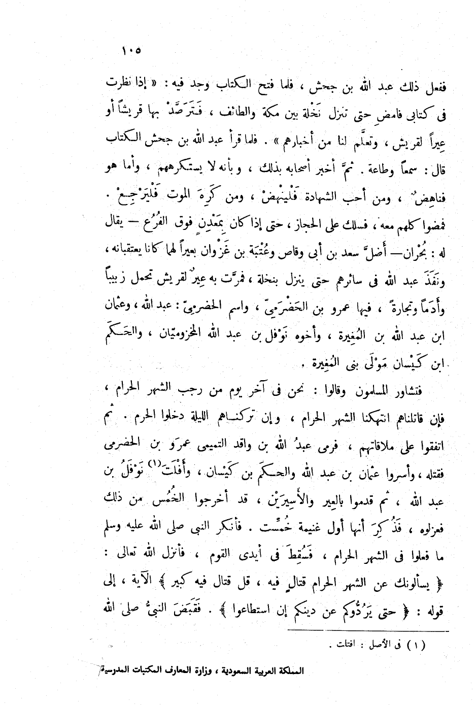 ففعل ذلك عبد الله بن جحش، فلما فتح الكتاب وجد فيه: " إذا نظرت في كتابي فامض حتى تنزل نخلة بين مكة والطائف، فترصد بها قريشاً أو عيراً لقريش، وتعلم لنا من أخبارهم ". فلما قرأ عبد الله بن جحش الكتاب قال: سمعاً وطاعة. ثم أخبر أصحابه بذلك، وبأنه لا يستكرههم، وأما هو فناهض، ومن أحب الشاهدة فلينهض، ومن كره الموت فليرجع. فمضوا كلهم معه، فسلك الحجاز، حتى إذا كان بمعدن فوق الفرع يقال له: بحران أضل سعد بن أبي وقاص وعتبة بن غزوان بعيراً لهما كانا يعتقبانه، ونفذ عبد الله في سائرهم حتى ينزل بنخلة، فمرت به عير لقريش تحمل زبيباً وأدماً وتجارة، فيها عمرو بن الحضرمي، واسم الحضرمي: عبد الله، وعثمان ابن عد الله بن المغيرة، وأخوه نوفل بن عبد المخزوميان، والحكم ابن كيسان موى بني المغيرة.