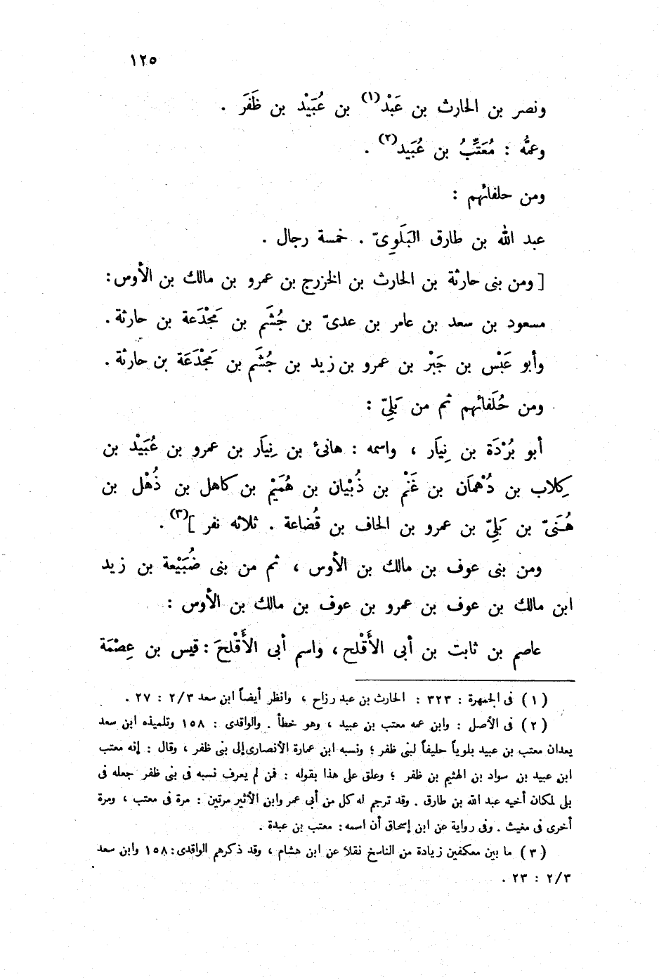 (3) ما بين معكفين زيادة من الناسخ نقلاً عن ابن هشام، وقد ذكرهم الواقدي: 158 وابن سعد 3 / 2: 23.