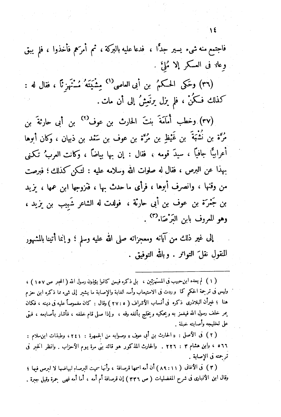(37) وخطب أمامة بنت الحارث بن عوف (2) بن أبي حارثة بن مرة بن نشبة بن غيظ بن مرة بن عوف بن سعد بن ذيبان، وكان أبوها أعرابيا جافياً، سيد قومه، فقال: إن بها بياضاً، وكانت العرب تكنى بهذا عن البرص، فقال له صلوات الله وسلامه عليه: لتكن كذلك؛ فبرصت من وقتها، وانصرف أبوها، فرأى ما حدث بها، فتزوجها ابن عمها، يزيد بن جمرة بن عوف بن أبي حارثة، فولدت له الشاعر شبيب بن يزيد وهو المعروف بابن البرصاء (3) .