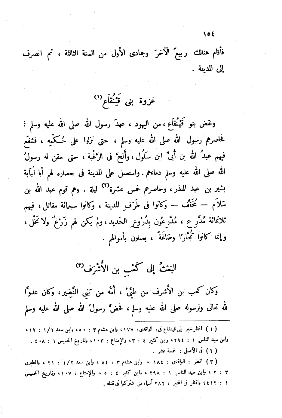 ونقض بنو قينقاع، من اليهود، عهد رسول الله صلى الله عليه وسلم؛ فحاصرهم رسول الله صلى الله عليه وسلم، حتى نزلوا على حكمه، فشفع فيهم عبد الله بن أبي ابن سلول، وألح في الرغبة، حتى حقن له رسول الله صلى الله عليه وسلم دماءهم. واستعمل على المدينة في حصاره لهم أبا لبابة بشير بن عبد المنذر، وحاصرهم خمس عشرة (2) ليلة. وهم قوم عبد الله بن سلام مخفف وكانوا في طرف المدينة، وكانوا سبعمائة مقاتل، فيهم ثلاثمائة مدرع، مدرعون بدروع الحديد، ولم يكن لهم زرع ولا نخل، وإنما كانوا تجاراً وصاغة، يعملون بأموالهم.