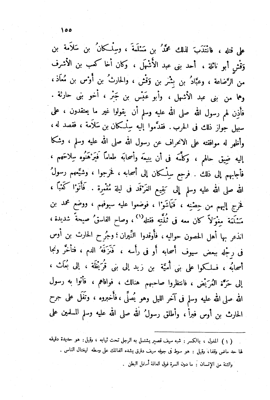 على قتله، فانتدب لذلك محمد بن مسلمة، وسلكان بن سلامة بن وقش أبو نائلة، أحد بني عبد الأشهل، وكان أخا كعب بن الأشرف من الرضاعة، وعباد بن بشر بن وقش، والحارث بن أوس بن معاذ، وهما من بني عبد الأشهل، وأبو عبس بن جبر، أخو بني حارثة. فأذن لهم رسول الله صلى الله عليه وسلم أن يقولوا غير ما يعتقدون، على سبيل جواز ذلك في الحرب. فقدموا إليه سلكان بن سلامة، فقصد له، وأظهر له موافقته على الانحراف عن رسول الله صلى الله عليه وسلم، وشكا إليه ضيق حالهم، وكلمه في أن يبيعه وأصحابه، فخرجوا، وشيعهم رسول الله صلى الله عليه وسلم إلى بقيع الغرقد في ليلة مقمرة. فأتوا كعباً، فخرج إليهم من حصنه، فتماشوا، فوضعوا عليه سيوفهم، ووضع محمد بن مسلمة مغولاً كان معه في ثنته فقتله (1) ، وصاح الفاسق صيحة شديدة، انذعر بها أهل الحصون حواليه، فأوقدوا النيران؛ وجرح الحارث بن أوس في رجله ببعض سيوف أصحابه أو في رأسه، فنزفه الدم، فتأخر ونجا أصحابه، فسلكوا على بني أمية بن زيد إلى بني قريظة، إلى بعاث، إلى حرة العريض، فانتظروا صاحبهم هنالك، فوافاهم، فأتوا به رسول الله صلى الله عليه وسلم في آخر الليل وهو يصلي، فأخبروه، وتفل على جرح الحارث بن أوس فبرأ، وأطلق رسول الله صلى الله عليه وسلم المسلمين على