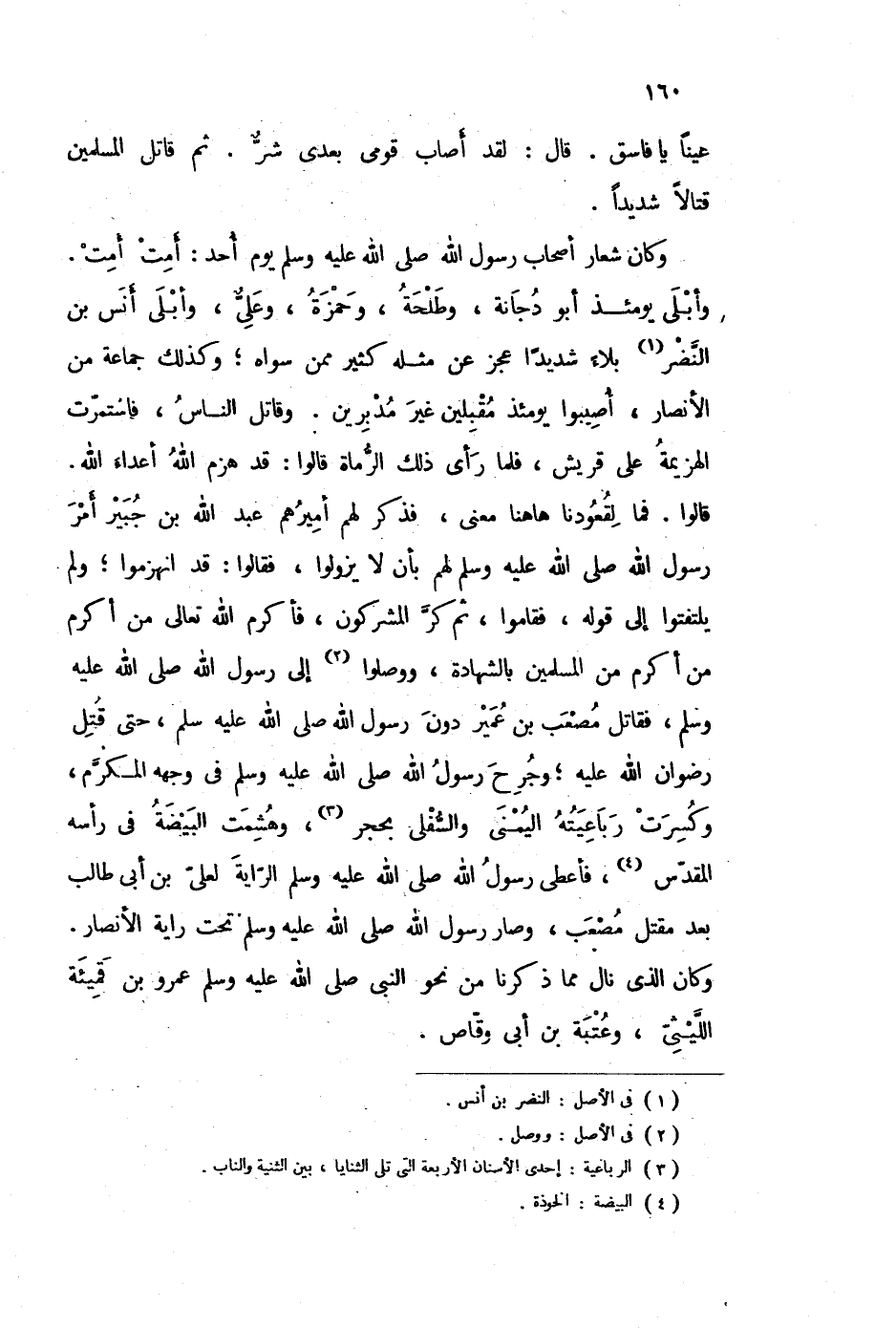 وكان شعار أصحاب رسول الله صلى الله عليه وسلم يوم أحد: أمت أمت. وأبلي يومئذ أبو دجانة، وطلحة، وحمزة، وعلي، وأبلى أنس بن النضر (1) بلاء شديداً عجز عن مثله كثير ممن سواه؛ وكذلك جماعة من الأنصار، أصيبوا يومئذ مقبلين غير مدبرين. وقاتل الناس، فاستمرت الهزيمة على قريش، فلما رأى ذلك الرماة قالوا: قد هزم الله أعداء الله. قالوا. فما لقعودنا هاهنا معنى، فذكر لهم أميرهم عبد الله بن جبير أمر رسول الله صلى الله عليه وسلم لهم بأن لا يزولوا، فقالوا: قد انهزموا؛ ولم يلتفتوا إلى قوله، فقاموا، ثم كر المشركون، فأكرم الله تعالى من أكرم من أكرم من المسلمين بالشهادة، ووصلوا (2) إلى رسول الله صلى الله عليه وسلم، فقاتل مصعب بن عمير دون رسول الله صلى الله عليه وسلم، حتى قتل رضوان الله عليه؛ وجرح رسول الله صلى الله عليه وسلم في وجهه المكرم، وكسرت رباعيته اليمنى والسفلى بحجر (3) ، وهشمت البيضة في رأسه المقدس (4) ، فأعطي رسول الله صلى الله عليه وسلم الراية لعلي بن أبي طالب بعد مقتل مصعب، وصار رسول الله صلى الله عليه وسلم تحت راية الأنصار. وكان الذي نال مما ذكرنا من نحو النبي صلى الله عليه وسلم عمرو بن قميثة الليثي، وعتبة بن أبي وقاص.