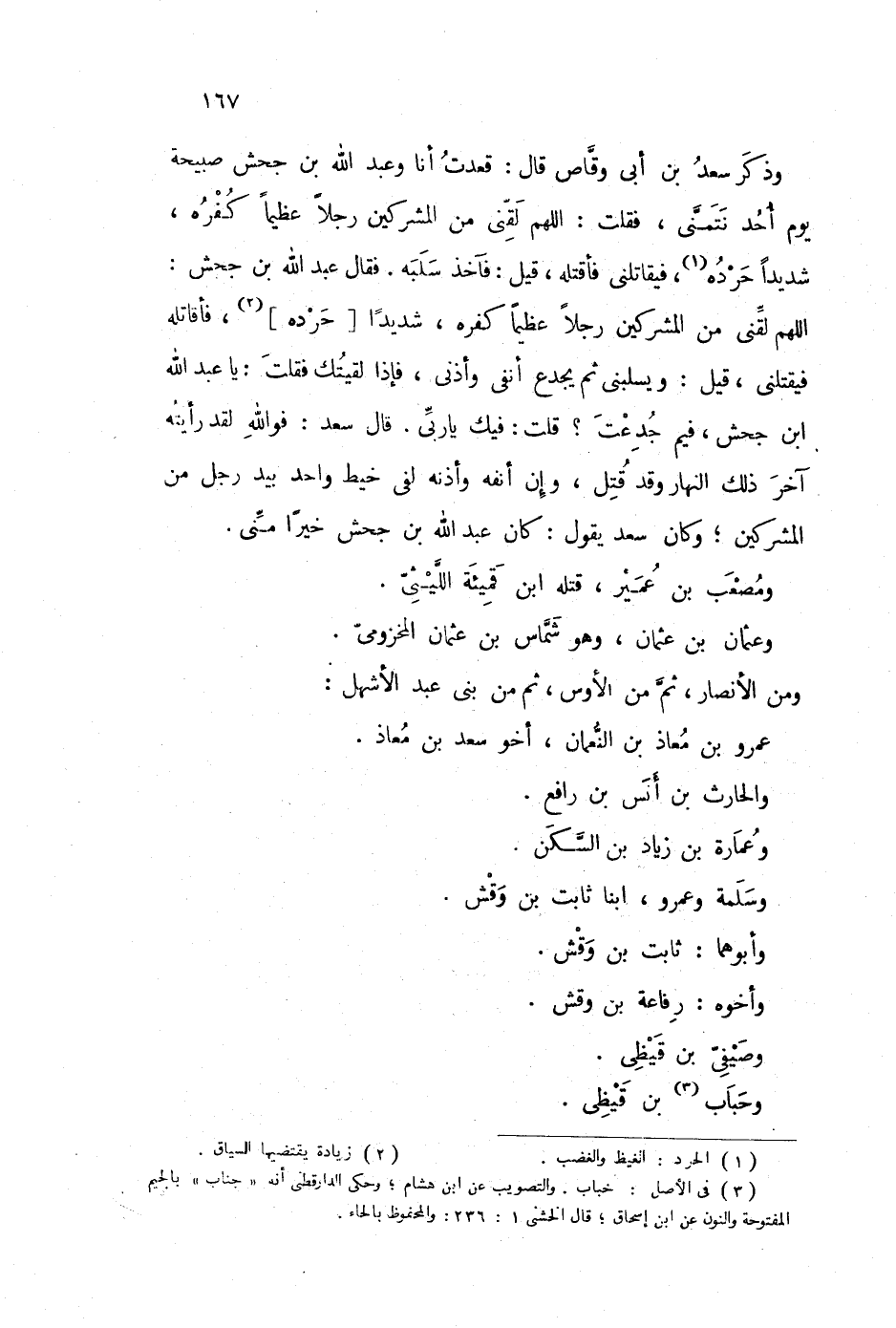 وذكر سعد بن أبي وقاص قال: قعدت أنا وعبد الله بن جحش صبيحة يوم أحد نتمنى، فقلت: اللهم لقني من المشركين رجلاً عظيماً كفره، شديداً حرده (1) ، فيقاتلني فأقتله: قيل: فآخذ سلبه. فقال عبد الله بن جحش: اللهم لقني من المشركين رجلاً عظيماً كفره، شديداً [حرده] (2) ، فأقاتله فيقتلني، قيل: ويسلبني ثم يجدع انفي وأذني، فإذا لقيتك فقلت: يا عبد الله ابن جحش، فيم جدعت قلت: فيك يا ربي. قال سعد: فوالله لقد رأيته آخر ذلك النهار وقد قتل، وإن أنفه وأذنه لفي خيط واحد بيد رجل من المشركين؛ وكان سعد يقول: كان عبد الله بن جحش خيراً مني.