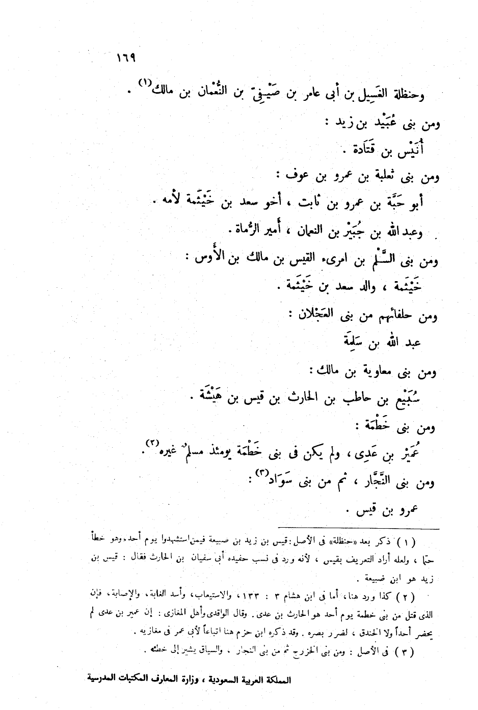 (1) ذكر بعد " حنظلة " في الأصل: قيس بن زيد بن ضبيعة فيمن استشهدوا يوم أحد، وهو خطأ حتماً، ولعله أراد التعريف بقيس، لأنه ورد في نسب حفيده أبي سفيان بن الحارث فقال: قيس بن زيد هو ابن ضبيعة.