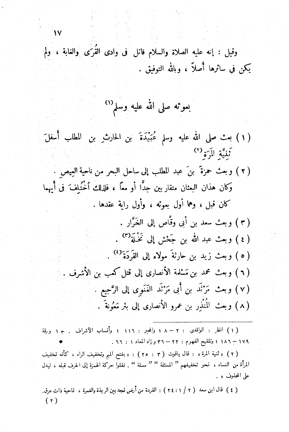 (2) وبعث حمزة بن عبد المطلب إلى ساحل البحر من ناحية العيص. وكان هذان البعثان متقاربين جداً أو معاً، فلذلك أختلف في ايهما كان قبل، وهما أول بعوثه، وأول رايه عقدها.