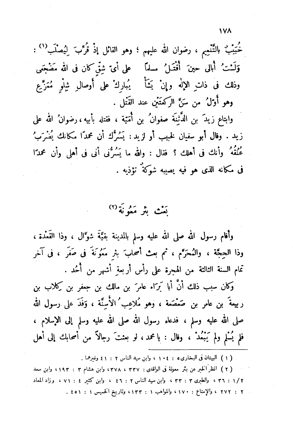 (2) انظر الخبر عن بئر معونة في الواقدي: 337، 378، وابن هشام 3: 193، وابن سعد 2 / 1: 36، والطبري 3: 33، وابن سيد الناس 2: 46، وابم كثير 4: 71، وزاد المعاد 2: 272، والإمتاع: 170 والمواهب 1: 133، وتاريخ الخميس 1: 451.